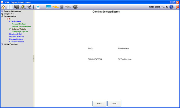 Before reflashing, you will be asked to confirm the Part Number to be programmed.  If the displayed Part Number is incorrect, select the “Back” button to return to the previous screen or the “Exit” button to return to the main menu.  Check the new ECM Part Number that is to be reflashed.  If the displayed New Part Number is correct, select “Reflash with upward compatible information.” and press the “Next” button.  When performing reflash to an upward compatible part number with accompanying hardware modification,  select “Proceed to upward compatible with accompanying hardware modification.” If the displayed Part Number is correct, first choose if you would like to reflash with the displayed criteria or proceed to upward compatible information with hardware modification.  Then select the “Next” button.