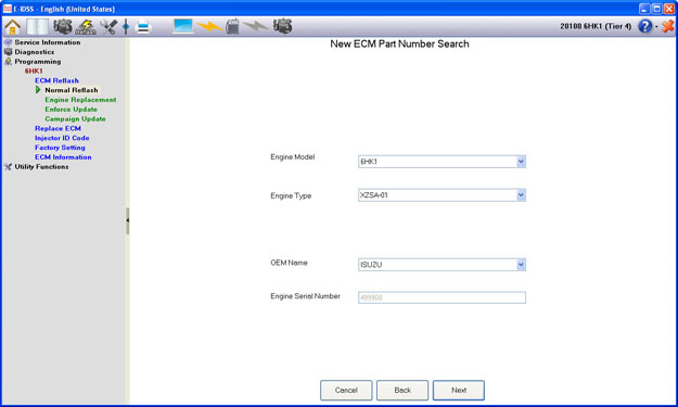 The ECM Information function allows you to use the current ECM Part Number to check the Engine Model and Engine Type that is specified.