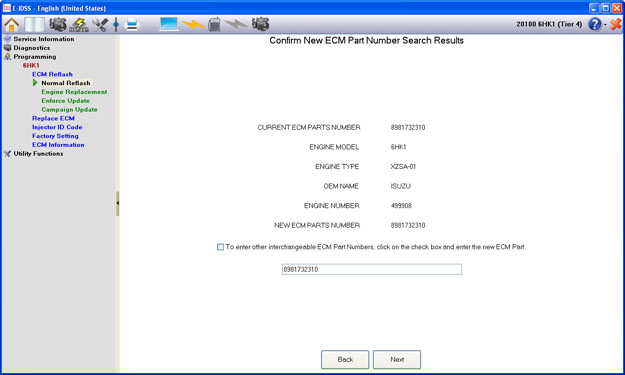 The new ECM Part Number will automatically be displayed from the current ECM Part Number information.  When this is the new target ECM Part Number, please confirm that this information is correct by selecting the “Next” button, or select the check box and enter another interchangeable ECM Part Number.