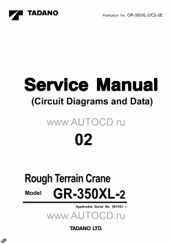 Заводская инструкция по ремонту крана Тадано - Tadano Rough Terrain Crane GR-350XL-2 содержит подробную информацию о сборке и разборке агрегатов, процедур диагностики, электрические схемы, моменты затяжек и др. Информация доступны на Английском и Японских языках. Если модель поставлялась только на локальный рынок Японии инструкции будут на Японском языке, книга с электрическими и гидравлическими схемами будут на английском.